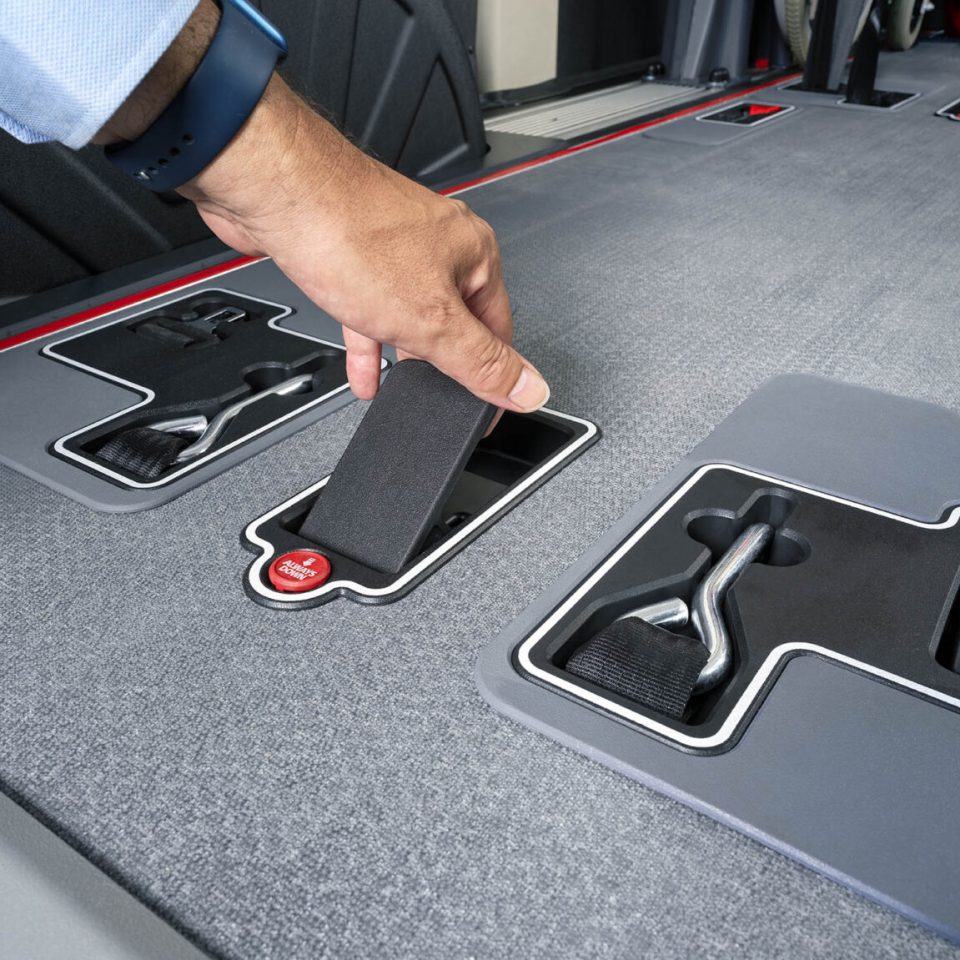 - Maximale flexibiliteit: dankzij ons innovatieve vloer- en stoelsysteem wisselt u moeiteloos tussen rolstoelplekken en zitplaatsen. Optimaliseer de inrichting van uw voertuig bij elke rit.