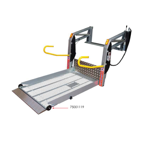 Dit wieltje zit zowel links als rechts gemonteerd onderaan het liftplateau. De wieltjes laten, zolang ze gelijktijdig de straat raken, de afrolbeveiliging neerklappen. Zorg dat het voertuig altijd zo recht en zo waterpas mogelijk staat geparkeerd, voordat u de lift bediend.